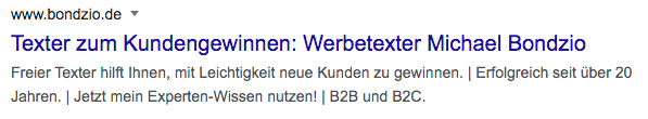 Dennoch lohnt es, die Meta-Description zu texten und dabei auf das wichtigste Keyword der Seite zu zielen. Dazu bringt man im vorderen Bereich der Meta-Description dieses Keyword unter und schreibt ansonsten einen aktivierenden Text, der den Suchenden in seiner aktuellen Situation anspricht und zum Klicken animiert.