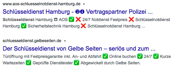 Es ist möglich, im Meta-Title oder in der Description auffällige Unicode-Sonderzeichen zu verwenden. Das sind einfarbige oder farbige Zeichen, die z.B. so aussehen: