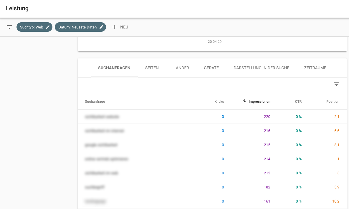 Dennoch gibt es keine Klicks, die CTR liegt bei 0 %. Wenn bei diesen Suchanfragen spannende Suchbegriffe für die jeweilige Website dabei sind, würde ich mir definitiv anschauen, wie sich die CTR durch bessere Snippets optimieren lässt.